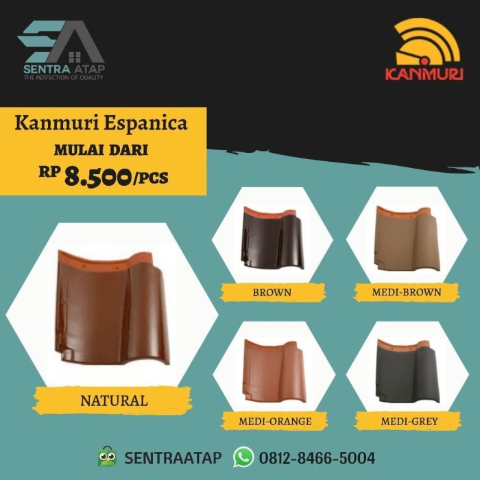 Sudah lama postingan kami tidak membahas tentang harga. Empat tahun berselang diluncurkan tipe milenio, lengkap dengan berbagai aksesoris genteng yang bukan hanya berfungsi sebagai penutup atap tetapi juga unsur estetika serta 'prestige' yang menonjol dari pemakm genteng ini. Genteng keramik kanmuri tipe espanica. Genteng m class iii.genteng kia cv.sukses mandiri teknik kompleks perkantoran mutiara bekasi centre blok b no.22, jl.raya a.yani kav.20, bekasi barat 17148 telp. Baik genteng kanmuri milenio, genteng kanmuri espanica maupun genteng kanmuri flat.